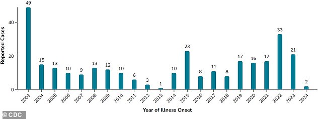 The CDC has recorded an average of 14 SLE cases annually in the US between 2003 and 2023 in humans.